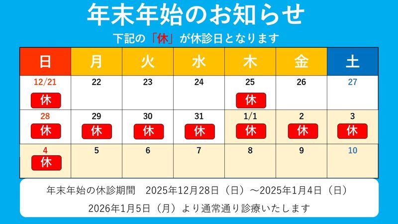12月28日(日)から1月4日(日)まで休診とさせていただきます。